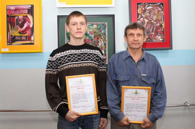Заместитель начальника УМВД полковник внутренней службы Сергей Токарь вручил Благодарственные письма участникам выставки — Виктору Кузнецову и его сыну Илье Кузнецову.